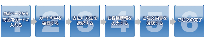 ご注文手続きの流れは、下図のように「商品ページから商品をカートに入れる」→「カートの中を確認する」→「支払い方法を選択する」→「お客様情報を入力する」→「ご注文内容を確認する」→「ご注文の完了」となります。